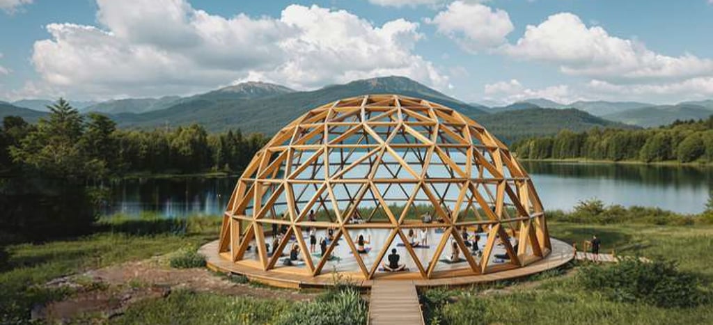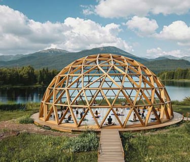 El Duomo para las actividades será de 10 metros de diámetro aproximadamente , y en uno de sus laterales tendremos una edificación con baños y cocina común para grandes grupos.