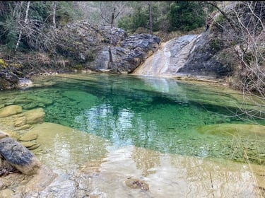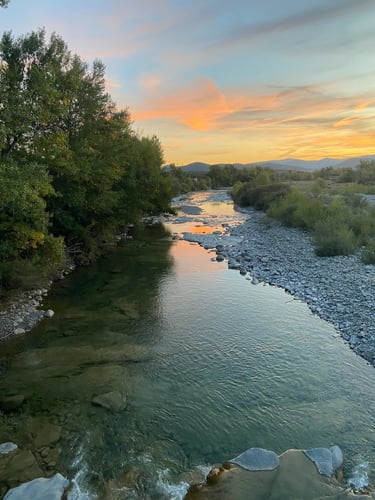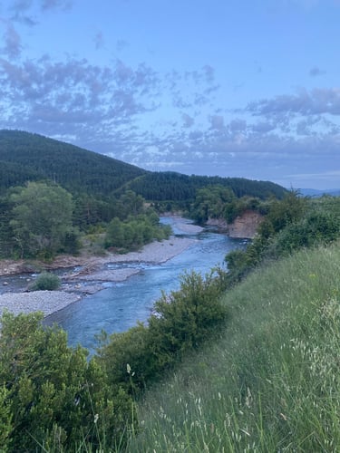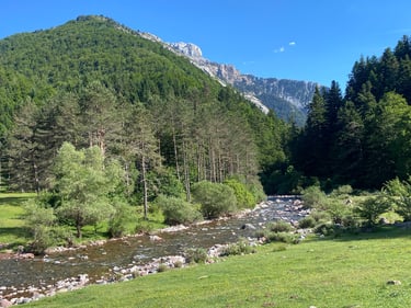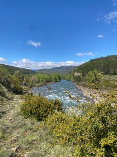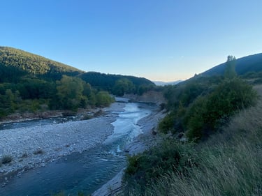 El río Aragón Subordán, uno de los ríos más importantes de la zona, con caudal constante durante todo el año y aguas cristalinas, atraviesa el terreno de punta a punta, proporcionándole energía inagotable. Nadar en sus gélidas aguas está permitido y tenemos dos puntos de acceso frente al terreno. Además de los beneficios para la salud de la exposición al agua fría, simplemente sentarse junto al río proporciona una profunda sensación de relajación; hasta incluso podría decirnos algo. Tal vez, luego de unos días, este hermoso y poderoso lugar, con todos sus atributos, nos ayude a relajarnos, encontrar paz y ver algo que no hemos podido ver hasta ahora. Este es el espíritu de mi sueño.